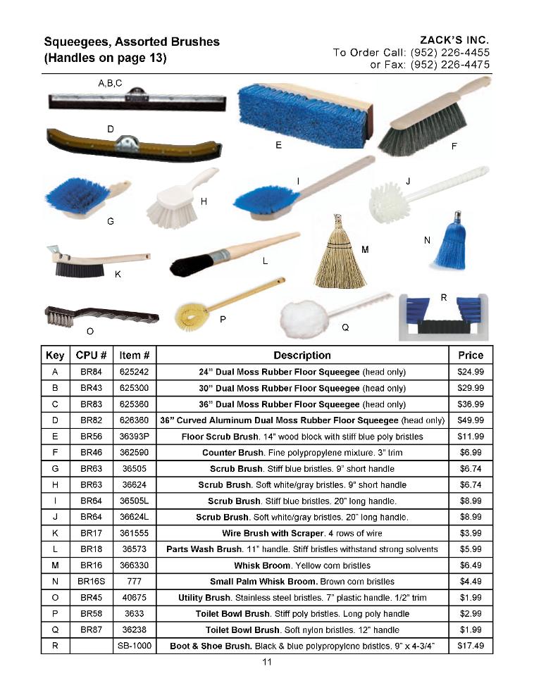 | Squeegees, Assorted Brushes (Handles on page 13) 24” Dual Moss Rubber Floor Squeegee (head only) 30” Dual Moss Rubber Floor Squeegee (head only) 36” Dual Moss Rubber Floor Squeegee (head only) 36” Curved Aluminum Dual Moss Rubber Floor Squeegee (head only) Floor Scrub Brush. 14” wood block with stiff blue poly bristles Counter Brush. Fine polypropylene mixture. 3” trim Scrub Brush. Stiff blue bristles. 9” short handle Scrub Brush. Soft white/gray bristles. 9” short handle Scrub Brush. Stiff blue bristles. 20” long handle. Scrub Brush. Soft white/gray bristles. 20” long handle. Wire Brush with Scraper. 4 rows of wire Parts Wash Brush. 11” handle. Stiff bristles withstand strong solvents Whisk Broom. Yellow corn bristles Small Palm Whisk Broom. Brown corn bristles Utility Brush. Stainless steel bristles. 7” plastic handle. 1/2” trim Toilet Bowl Brush. Stiff poly bristles. Long poly handle Toilet Bowl Brush. Soft nylon bristles. 12” handle |
