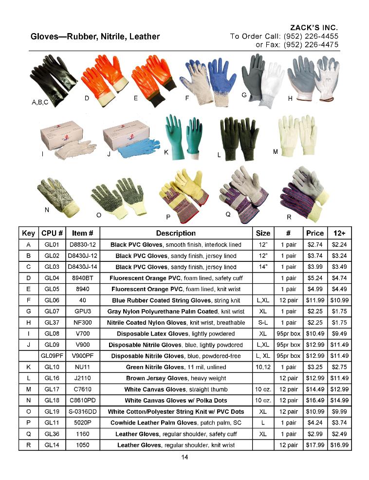 | Gloves--Rubber, Nitrile, Leather Black PVC Gloves, smooth finish, interlock lined Black PVC Gloves, sandy finish, jersey lined Black PVC Gloves, sandy finish, jersey lined Fluorescent Orange PVC, foam lined, safety cuff Fluorescent Orange PVC, foam lined, knit wrist Blue Rubber Coated String Gloves, string knit Gray Nylon Polyurethane Palm Coated, knit wrist Nitrile Coated Nylon Gloves, knit wrist, breathable Disposable Latex Gloves, lightly powdered Disposable Nitrile Gloves, blue, lightly powdered Disposable Nitrile Gloves, blue, powdered-free Green Nitrile Gloves, 11 mil, unlined Brown Jersey Gloves, heavy weight White Canvas Gloves, straight thumb White Canvas Gloves w/ Polka Dots White Cotton/Polyester String Knit w/ PVC Dots Cowhide Leather Palm Gloves, reinforced palm, SC Leather Gloves, regular shoulder, safety cuff Leather Gloves, regular shoulder, knit wrist |