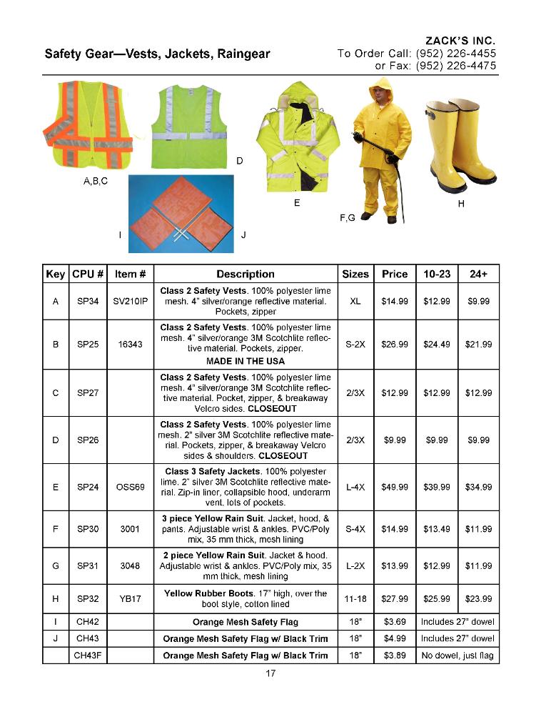 | Safety Gear—Vests, Jackets, Raingear Class 2 Safety Vests. 100% polyester lime mesh. 4” silver/orange reflective material. Pockets, zipper Class 2 Safety Vests. 100% polyester lime mesh. 4” silver/orange 3M Scotchlite reflective material. Pockets, zipper. MADE IN THE USA Class 2 Safety Vests. 100% polyester lime mesh. 4” silver/orange 3M Scotchlite reflective material. Pocket, zipper, & breakaway Velcro sides. CLOSEOUT Class 2 Safety Vests. 100% polyester lime mesh. 2” silver 3M Scotchlite reflective material. Pockets, zipper, & breakaway Velcro sides & shoulders. CLOSEOUT Class 3 Safety Jackets. 100% polyester lime. 2” silver 3M Scotchlite reflective material. Zip-in liner, collapsible hood, underarm vent, lots of pockets. 3 piece Yellow Rain Suit. Jacket, hood, & pants. Adjustable wrist & ankles. PVC/Poly mix, 35 mm thick, mesh lining 2 piece Yellow Rain Suit. Jacket & hood. Adjustable wrist & ankles. PVC/Poly mix, 35 mm thick, mesh lining Yellow Rubber Boots. 17” high, over the boot style, cotton lined |