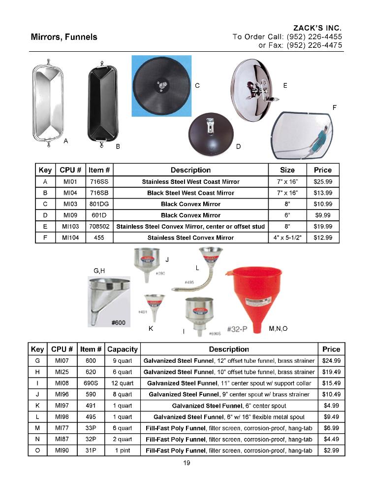 | Mirrors, Funnels Stainless Steel West Coast Mirror Black Steel West Coast Mirror Black Convex Mirror Black Convex Mirror Stainless Steel Convex Mirror, center or offset stud Stainless Steel Convex Mirror Galvanized Steel Funnel, 12” offset tube funnel, brass strainer Galvanized Steel Funnel, 10” offset tube funnel, brass strainer Galvanized Steel Funnel, 11” center spout w/ support collar Galvanized Steel Funnel, 9” center spout w/ brass strainer Galvanized Steel Funnel, 6” center spout Galvanized Steel Funnel, 6” w/ 16” flexible metal spout Fill-Fast Poly Funnel, filter screen, corrosion-proof, hang-tab Fill-Fast Poly Funnel, filter screen, corrosion-proof, hang-tab Fill-Fast Poly Funnel, filter screen, corrosion-proof, hang-tab |
