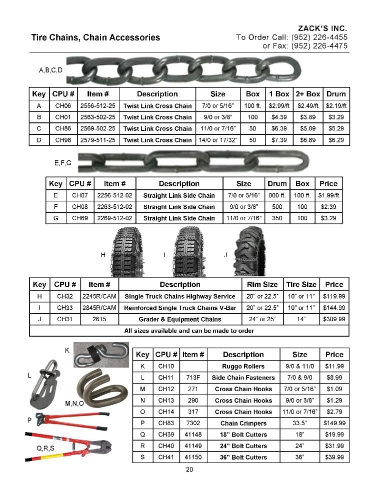 | Tire Chains, Chain Accessories Twist Link Cross Chain Twist Link Cross Chain Twist Link Cross Chain Twist Link Cross Chain Straight Link Side Chain Straight Link Side Chain Straight Link Side Chain Single Truck Chains Highway Service Reinforced Single Truck Chains V-Bar Grader & Equipment Chains Ruggo Rollers Side Chain Fasteners Cross Chain Hooks Cross Chain Hooks Cross Chain Hooks Chain Crimpers 18” Bolt Cutters 24” Bolt Cutters 36” Bolt Cutters |