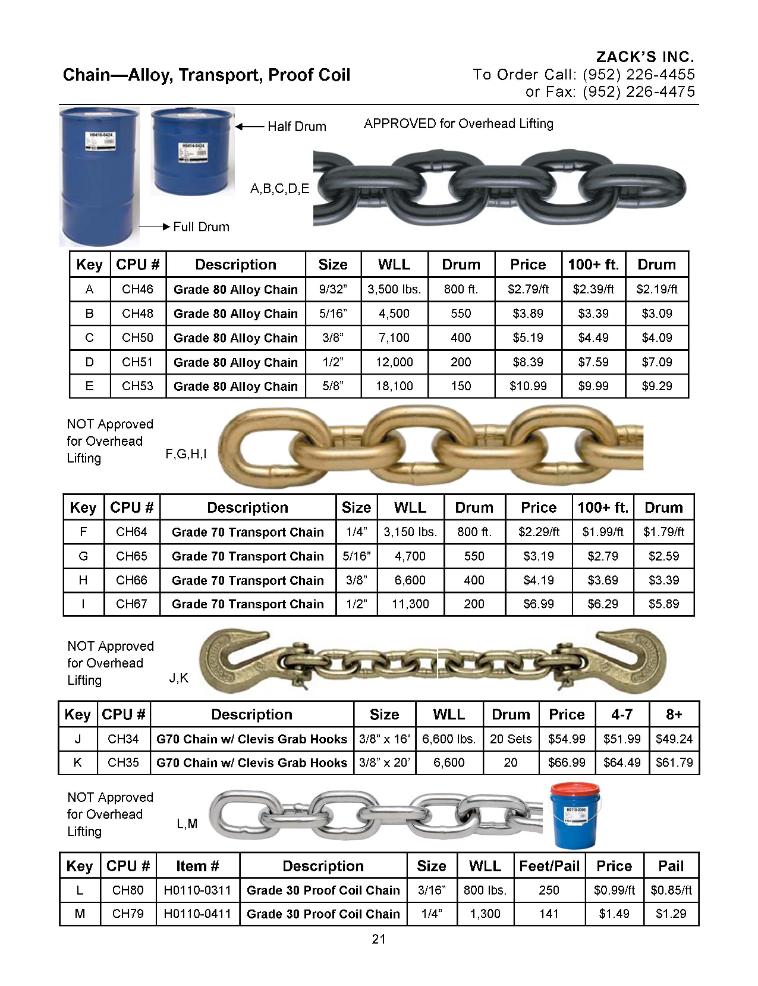 | Chain—Alloy, Transport, Proof Coil Grade 80 Alloy Chain Grade 80 Alloy Chain Grade 80 Alloy Chain Grade 80 Alloy Chain Grade 80 Alloy Chain Grade 70 Transport Chain Grade 70 Transport Chain Grade 70 Transport Chain Grade 70 Transport Chain G70 Chain w/ Clevis Grab Hooks G70 Chain w/ Clevis Grab Hooks Grade 30 Proof Coil Chain Grade 30 Proof Coil Chain |