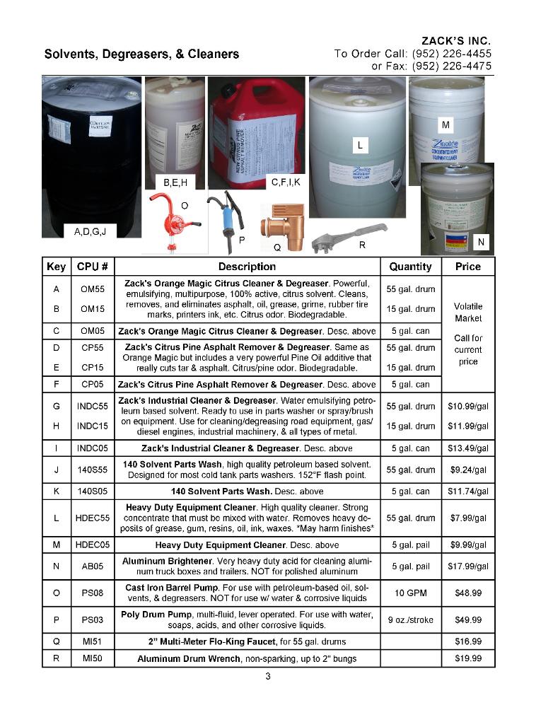 | Solvents, Degreasers, & Cleaners Zack's Orange Magic Citrus Cleaner & Degreaser. Powerful, emulsifying, multipurpose, 100% active, citrus solvent. Cleans, removes, and eliminates asphalt, oil, grease, grime, rubber tire marks, printers ink, etc. Citrus odor. Biodegradable. Zack's Orange Magic Citrus Cleaner & Degreaser. Desc. above Zack's Citrus Pine Asphalt Remover & Degreaser. Same as Orange Magic but includes a very powerful Pine Oil additive that really cuts tar & asphalt. Citrus/pine odor. Biodegradable. Zack's Citrus Pine Asphalt Remover & Degreaser. Desc. above Zack's Industrial Cleaner & Degreaser. Water emulsifying petroleum based solvent. Ready to use in parts washer or spray/brush on equipment. Use for cleaning/degreasing road equipment, gas/diesel engines, industrial machinery, & all types of metal. Zack's Industrial Cleaner & Degreaser. Desc. above 140 Solvent Parts Wash, high quality petroleum based solvent. Designed for most cold tank parts washers. 152°F flash point. 140 Solvent Parts Wash. Desc. above Heavy Duty Equipment Cleaner. High quality cleaner. Strong concentrate that must be mixed with water. Removes heavy deposits of grease, gum, resins, oil, ink, waxes. *May harm finishes* Heavy Duty Equipment Cleaner. Desc. above Aluminum Brightener. Very heavy duty acid for cleaning aluminum truck boxes and trailers. NOT for polished aluminum Cast Iron Barrel Pump. For use with petroleum-based oil, solvents, & degreasers. NOT for use w/ water & corrosive liquids Poly Drum Pump, multi-fluid, lever operated. For use with water, soaps, acids, and other corrosive liquids. 2” Multi-Meter Flo-King Faucet, for 55 gal. drums Aluminum Drum Wrench, non-sparking, up to 2" bungs |