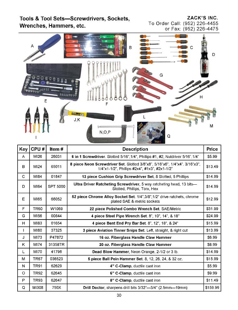 | Tools & Tool Sets—Screwdrivers, Sockets, Wrenches, Hammers, etc. 6 in 1 Screwdriver. Slotted 5/16”,1/4”, Phillips #1, #2, Nutdriver 5/16”,1/4” 8 piece Neon Screwdriver Set. Slotted 3/8”x8”, 5/16”x6”, 1/4”x4”, 3/16”x3”, 1/4”x1-1/2”, Phillips #2x4”, #1x3”, #2x1-1/2” 13 piece Cushion Grip Screwdriver Set, 8 Slotted, 5 Phillips Ultra Driver Ratcheting Screwdriver, 5 way ratcheting head, 13 bits—Slotted, Phillips, Torx, Hex 52 piece Chrome Alloy Socket Set. 1/4”,3/8”,1/2” drive ratchets, chrome plated SAE & metric sockets 22 piece Polished Combo Wrench Set. SAE/Metric 4 piece Steel Pipe Wrench Set. 8”, 10”, 14”, & 18” 4 piece Bent End Pry Bar Set. 8”, 12”, 18”, & 24” 3 piece Aviation Tinner Snips Set. Left, straight, & right cut 16 oz. Fiberglass Handle Claw Hammer 20 oz. Fiberglass Handle Claw Hammer Dead Blow Hammer, Neon Orange, 2-1/2 or 3 lb. 5 piece Ball Pein Hammer Set. 8, 12, 26, 24, & 32 oz. 4” C-Clamp, ductile cast iron 6” C-Clamp, ductile cast iron 8” C-Clamp, ductile cast iron Drill Doctor, sharpens drill bits 3/32”—3/4” (2.5mm—19mm) |