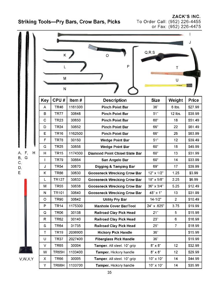| Striking Tools—Pry Bars, Crow Bars, Picks Pinch Point Bar 36” 6 lbs. Pinch Point Bar 51” 12 lbs. Pinch Point Bar 60” 18 Pinch Point Bar 66” 22 Pinch Point Bar 66” 26 Wedge Point Bar 51” 12 Wedge Point Bar 60” 18 Diamond Point Chisel Slate Bar 60” 13 San Angelo Bar 60” 14 Digging & Tamping Bar 69” 17 Gooseneck Wrecking Crow Bar 12” x 1/2” 1.25 Gooseneck Wrecking Crow Bar 18” x 5/8” 2.25 Gooseneck Wrecking Crow Bar 36” x 3/4” 5.25 Gooseneck Wrecking Crow Bar 48” x 1” 13 Utility Pry Bar 14-1/2” 2 Manhole Cover Bar/Tool 24” x .625” 3.75 Railroad Clay Pick Head 21” 5 Railroad Clay Pick Head 23” 6 Railroad Clay Pick Head 25” 7 Hickory Pick Handle 36” Fiberglass Pick Handle 36” Tamper. All steel. 10” grip 8” x 8” 12 Tamper. Hickory handle 8” x 8” 12 Tamper. All steel. 10” grip 10” x 10” 14 Tamper. Hickory handle 10” x 10” 14 |