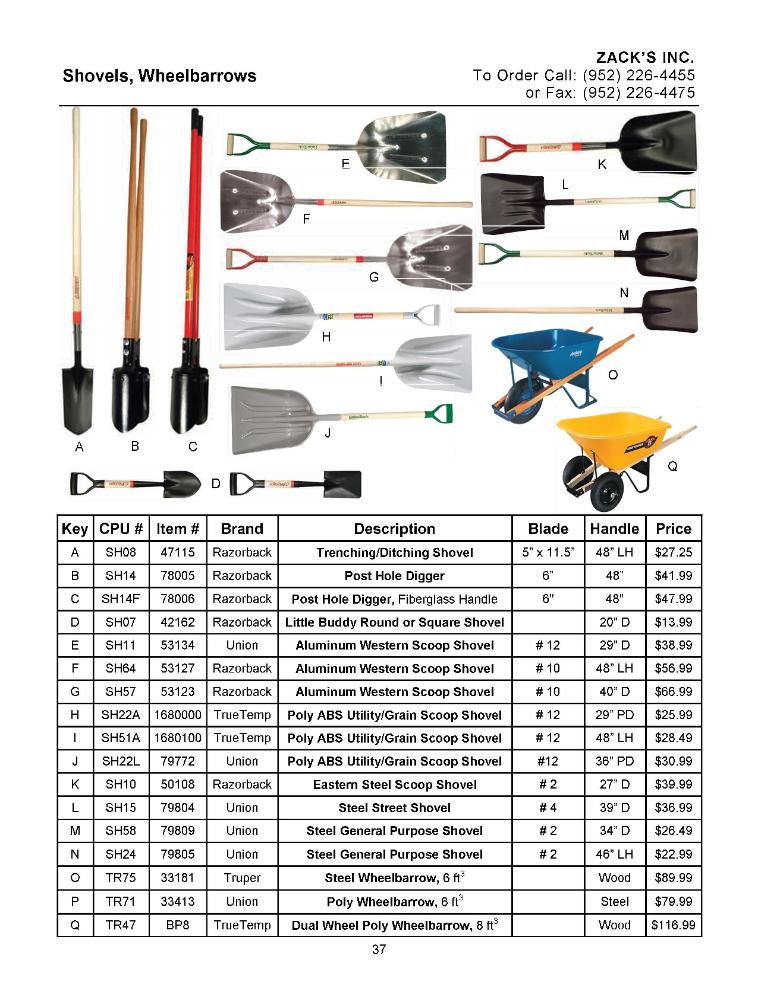 | Shovels, Wheelbarrows Razorback Trenching/Ditching Shovel Razorback Post Hole Digger Razorback Post Hole Digger, Fiberglass Handle Razorback Little Buddy Round or Square Shovel Union Aluminum Western Scoop Shovel Razorback Aluminum Western Scoop Shovel Razorback Aluminum Western Scoop Shovel TrueTemp Poly ABS Utility/Grain Scoop Shovel Union Poly ABS Utility/Grain Scoop Shovel TrueTemp Poly ABS Utility/Grain Scoop Shovel Razorback Eastern Steel Scoop Shovel Union Steel Street Shovel Union Steel General Purpose Shovel Union Steel General Purpose Shovel Truper Steel Wheelbarrow, 6 ft3 Union Poly Wheelbarrow, 6 ft3 TrueTemp Dual Wheel Poly Wheelbarrow, 8 ft3 |
