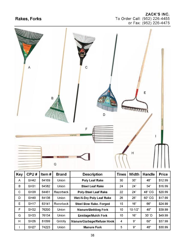 | Rakes, Forks Union Poly Leaf Rake Union Steel Leaf Rake Razorback Poly-Steel Leaf Rake Union Wet-N-Dry Poly Leaf Rake Razorback Steel Bow Rake. Forged Union Manure/Bedding Fork Grizzly Ensilage/Mulch Fork Grizzly Manure/Garbage/Refuse Hook Truper Manure Fork |