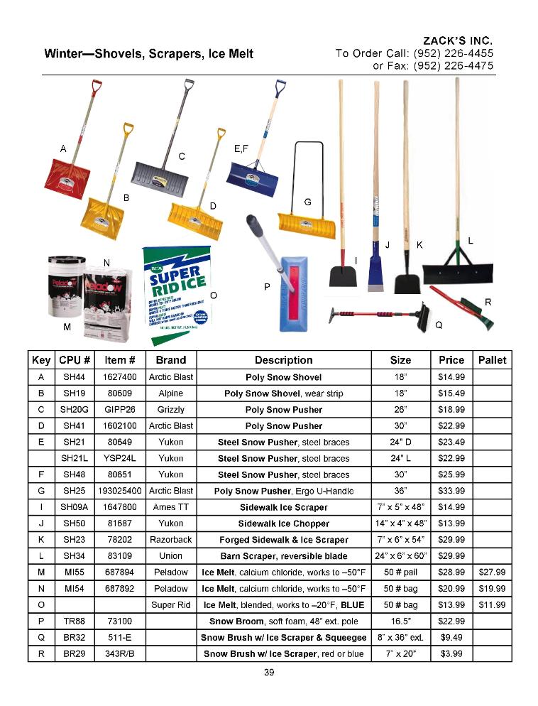 | Winter—Shovels, Scrapers, Ice Melt Nordic Poly Snow Shovel Alpine Poly Snow Shovel, wear strip Grizzly Poly Snow Pusher Alpine Poly Snow Pusher Yukon Steel Snow Pusher, steel braces Yukon Steel Snow Pusher, steel braces Yukon Steel Snow Pusher, steel braces Alpine Poly Snow Pusher, U-Handle Ames TT Sidewalk Ice Scraper Yukon Sidewalk Ice Chopper Razorback Forged Sidewalk & Ice Scraper Union Barn Scraper, reversible blade Peladow Ice Melt, calcium chloride, works to –50°F Peladow Ice Melt, calcium chloride, works to –50°F Super Rid Ice Melt, blended, works to –20°F, BLUE Snow Broom, soft foam, 48” ext. pole Snow Brush w/ Ice Scraper & Squeegee Snow Brush w/ Ice Scraper, red or blue |