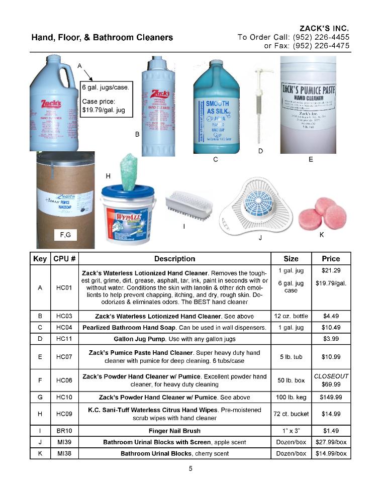| Hand, Floor, & Bathroom Cleaners Zack’s Waterless Lotionized Hand Cleaner. Removes the toughest grit, grime, dirt, grease, asphalt, tar, ink, paint in seconds with or without water. Conditions the skin with lanolin & other rich emollients to help prevent chapping, itching, and dry, rough skin. Deodorizes & eliminates odors. The BEST hand cleaner Zack’s Waterless Lotionized Hand Cleaner. See above Pearlized Bathroom Hand Soap. Can be used in wall dispensers. Gallon Jug Pump. Use with any gallon jugs Zack’s Pumice Paste Hand Cleaner. Super heavy duty hand cleaner with pumice for deep cleaning. 6 tubs/case Zack’s Powder Hand Cleaner w/ Pumice. Excellent powder hand cleaner, for heavy duty cleaning Zack’s Powder Hand Cleaner w/ Pumice. See above K.C. Sani-Tuff Waterless Citrus Hand Wipes. Pre-moistened scrub wipes with hand cleaner Finger Nail Brush Bathroom Urinal Blocks with Screen, apple scent Bathroom Urinal Blocks, cherry scent |